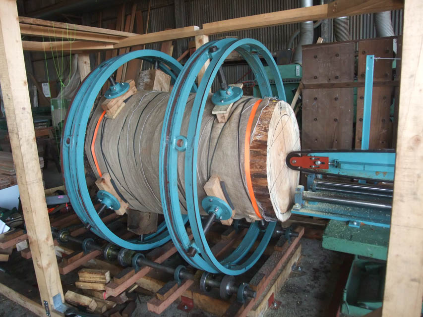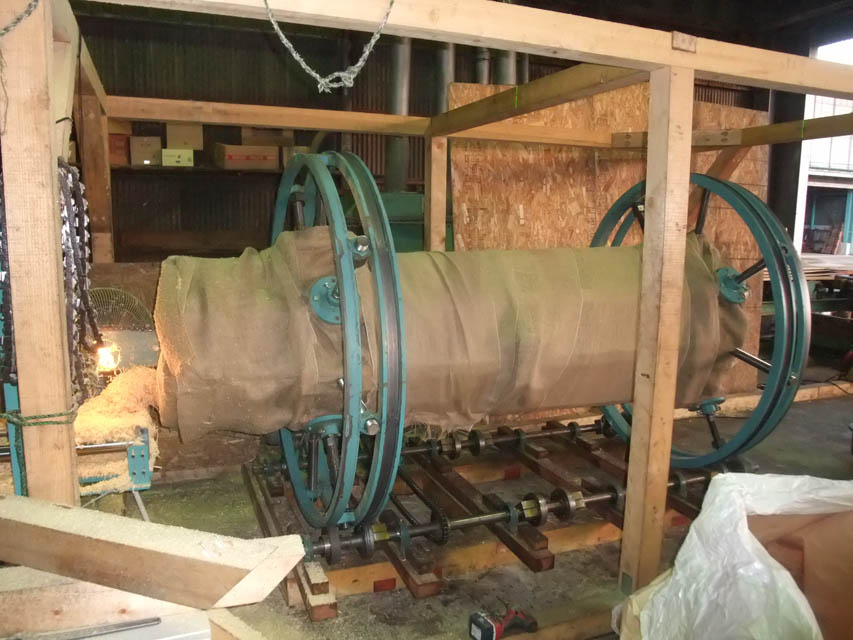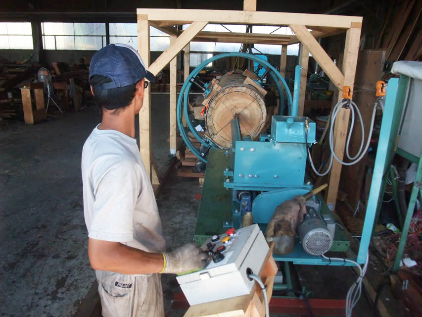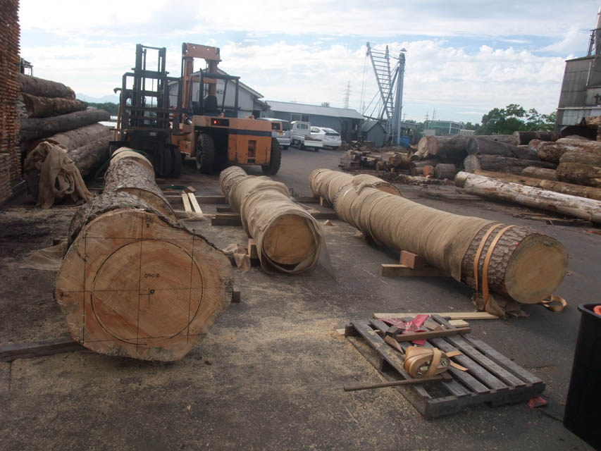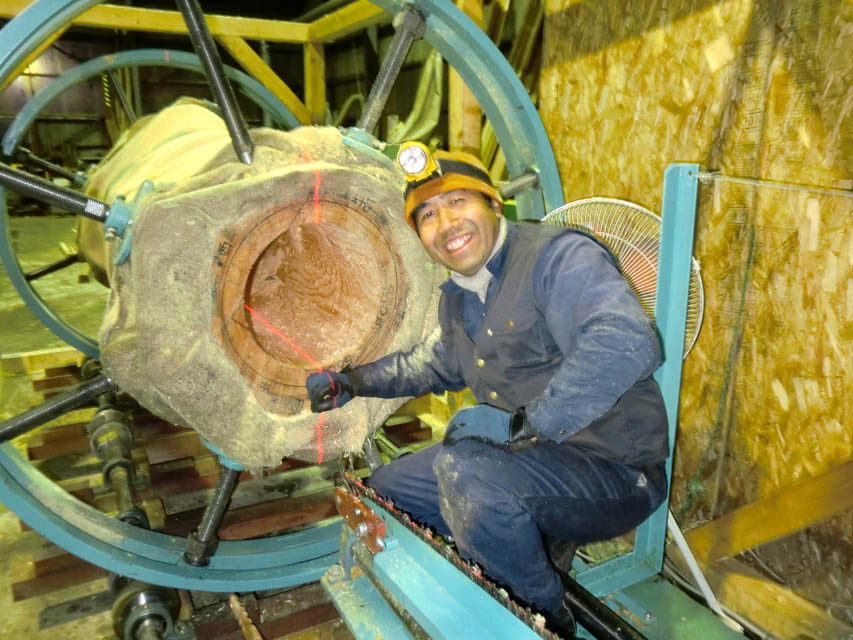 立ち木の状態から3つに分割後、穴あけ工程を弊社が担当。自社開発した専用機械により、原木丸太内に鉄とカーボンの芯を挿入するための穴あけ作業を実施。